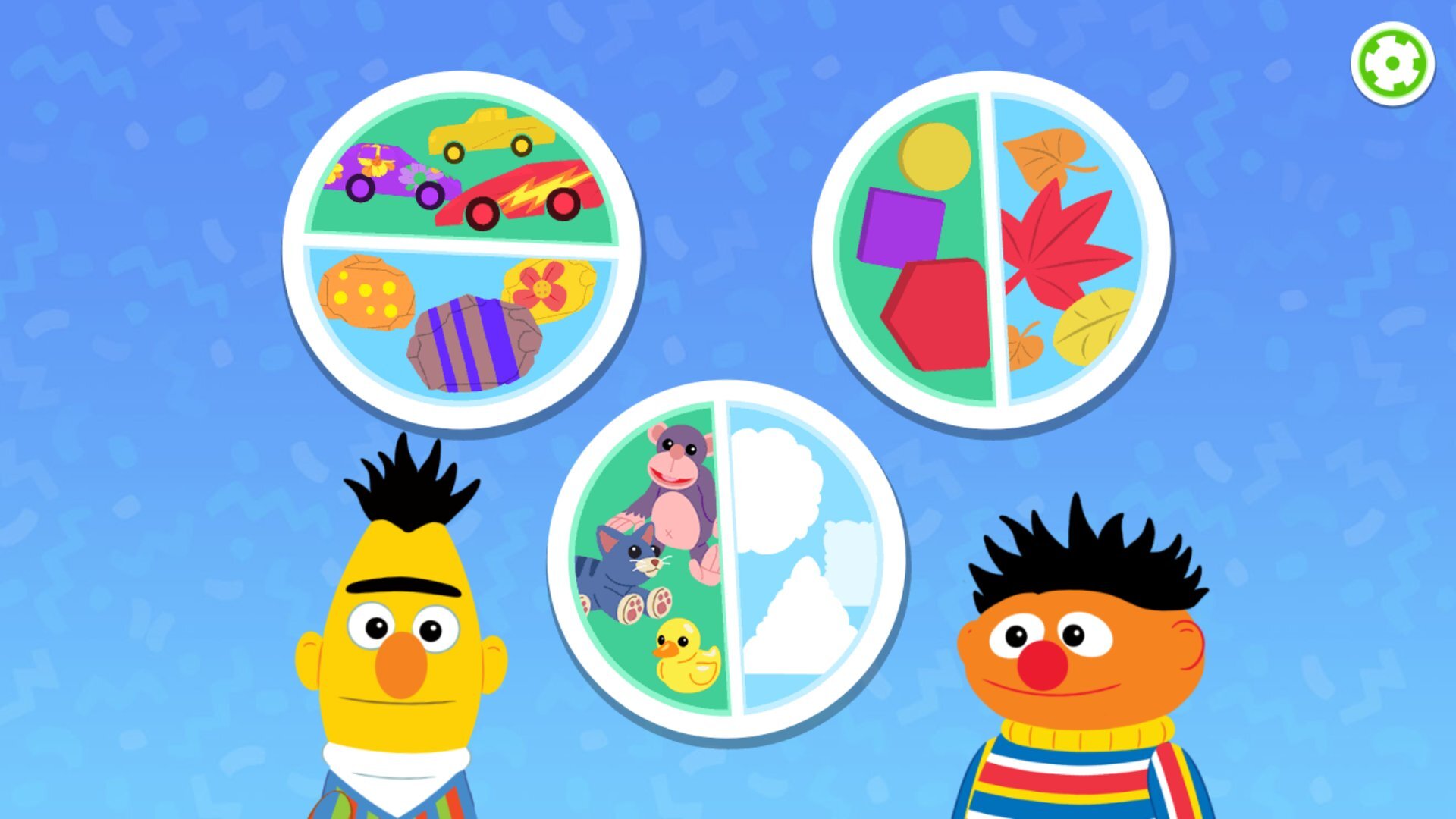 Players learn object recognition by identifying the size, shape, and color of things they see in their everyday life. Learn the differences between owls and ducks by observing and identifying unique features of stuffed animals with Ernie or group together similar blocks with Bert.